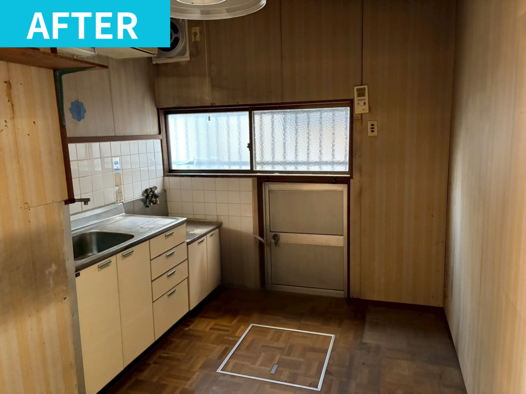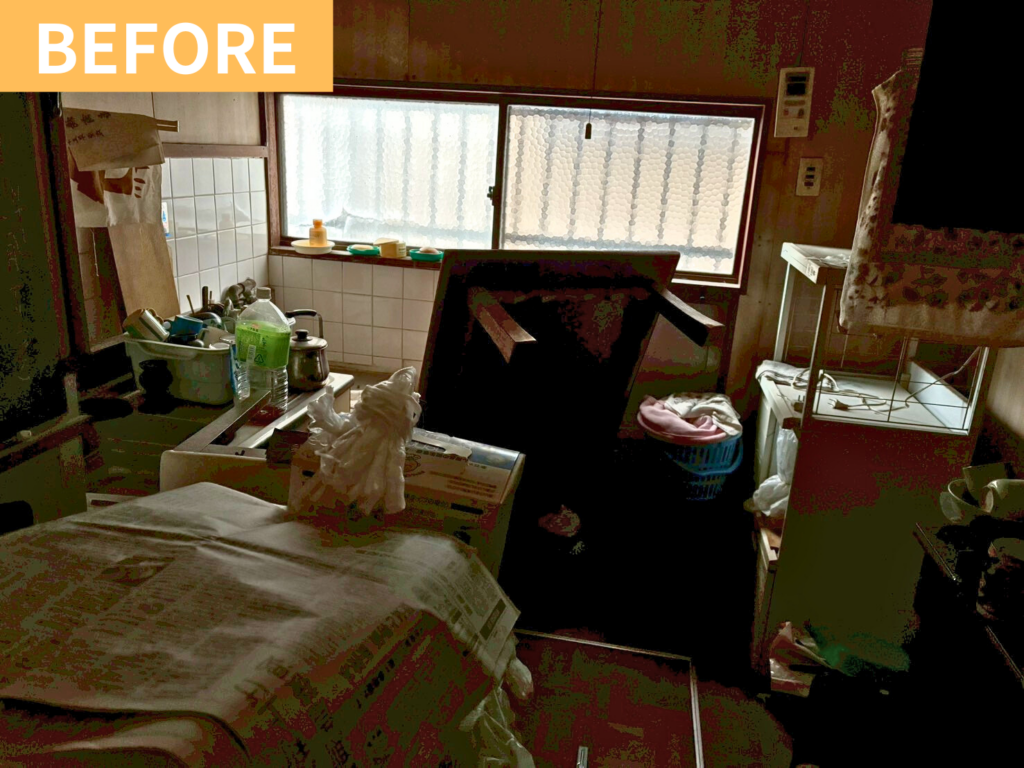 キッチン:物が散乱している状態👉不用品を全て撤去、明るく清潔な空間に