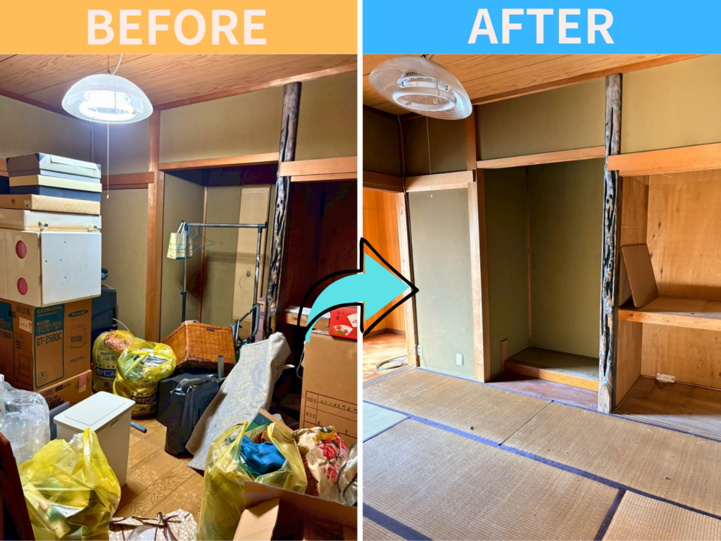 ①和室1:荷物が大量に散乱👉すっきりと片付き、畳が見える状態に